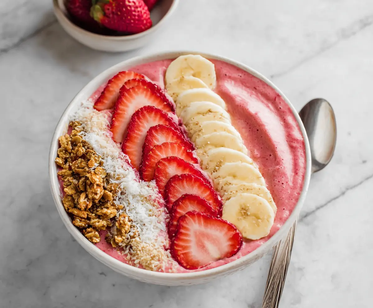 Vibrant strawberry banana smoothie bowl topped with fresh fruit and granola, perfect for a healthy breakfast.