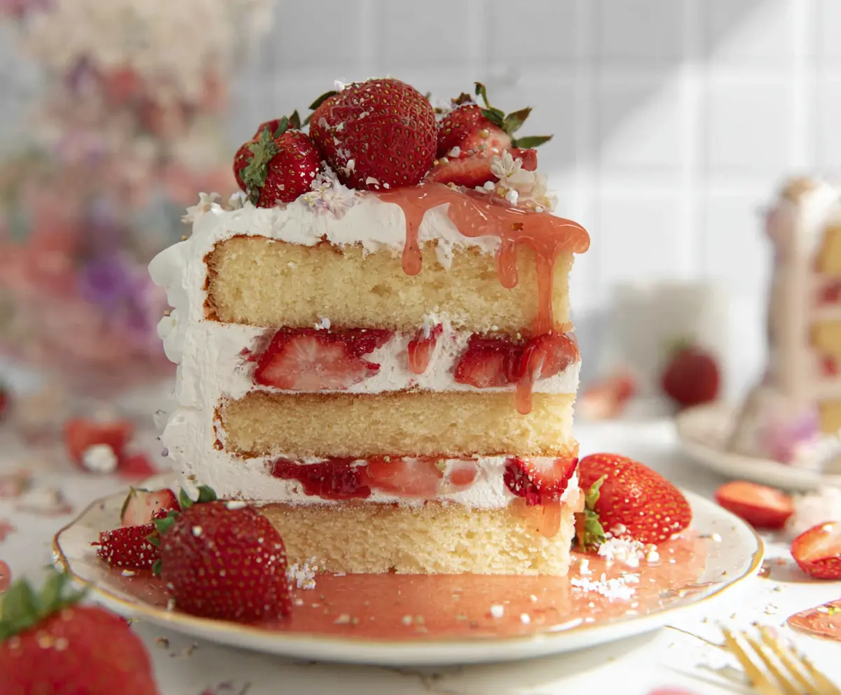 If you’d like thinner layers, use a serrated knife to slice each cake layer horizontally in half. Place one layer on a serving plate and spread a generous layer of whipped cream on top. Then, spoon some of the macerated strawberries along with their juices over the whipped cream.