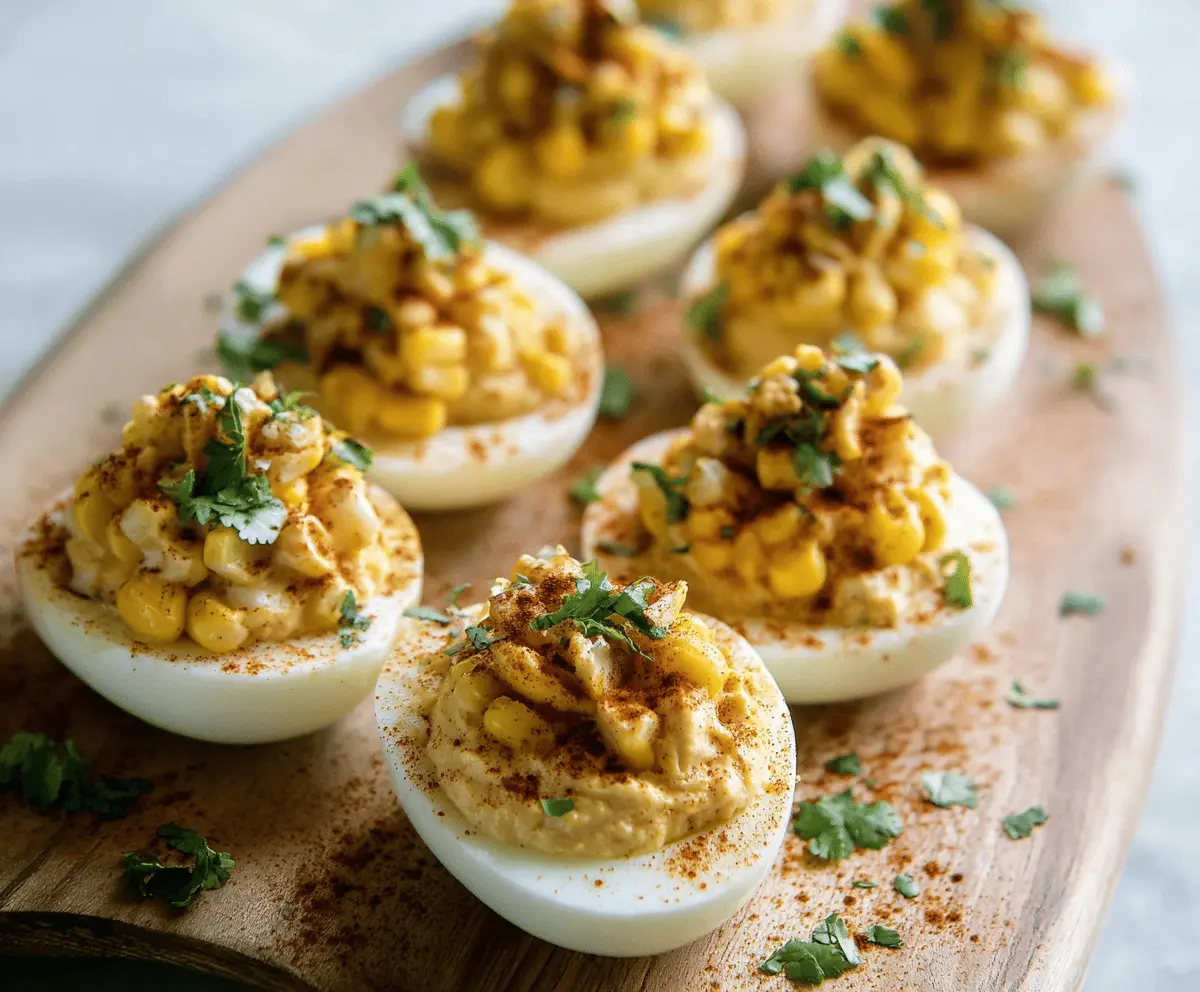These Street Corn Deviled Eggs are a fun twist on a classic! They feature creamy yolks mixed with sweet corn, tangy lime, and a touch of spicy seasoning. Yum!
