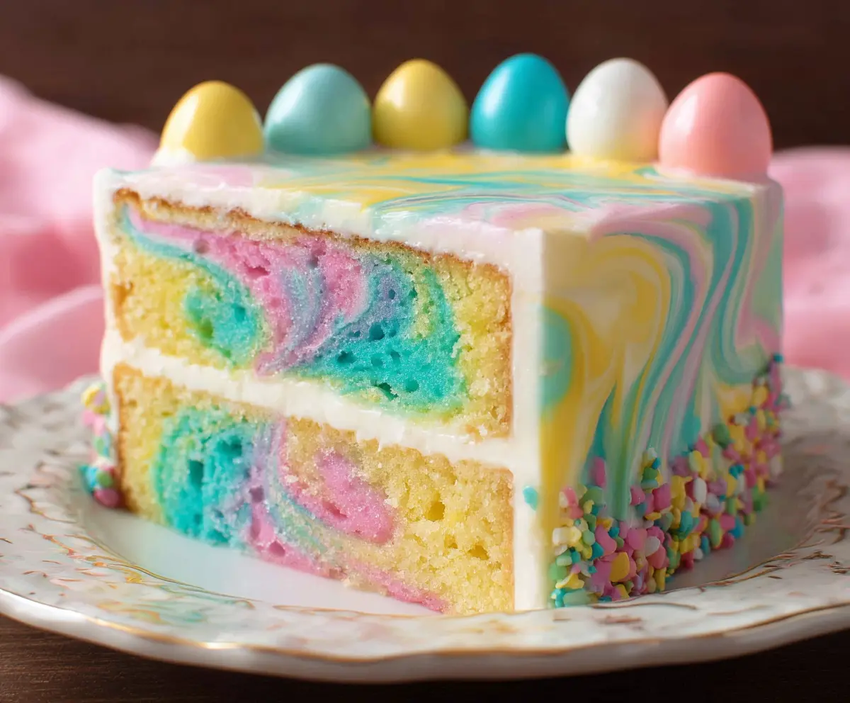 This colorful Swirled Easter Cake is a fun treat for the holiday! It features bright layers of cake twisted together, looking like a cheerful rainbow.