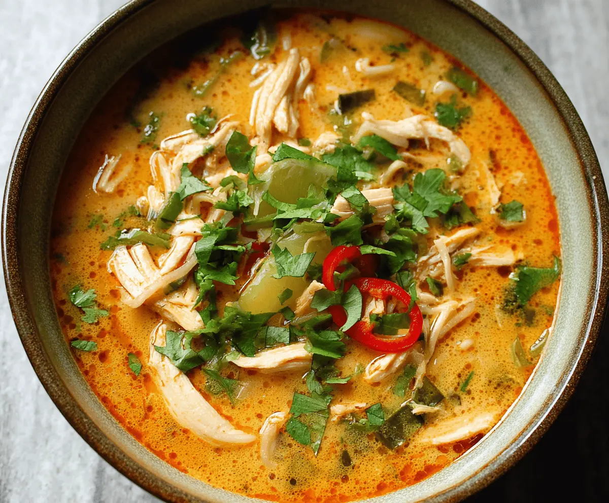 A bowl of flavorful Thai Curry Chicken Soup featuring tender chicken, vibrant vegetables, and aromatic Thai spices served in a white bowl on a rustic wooden table.