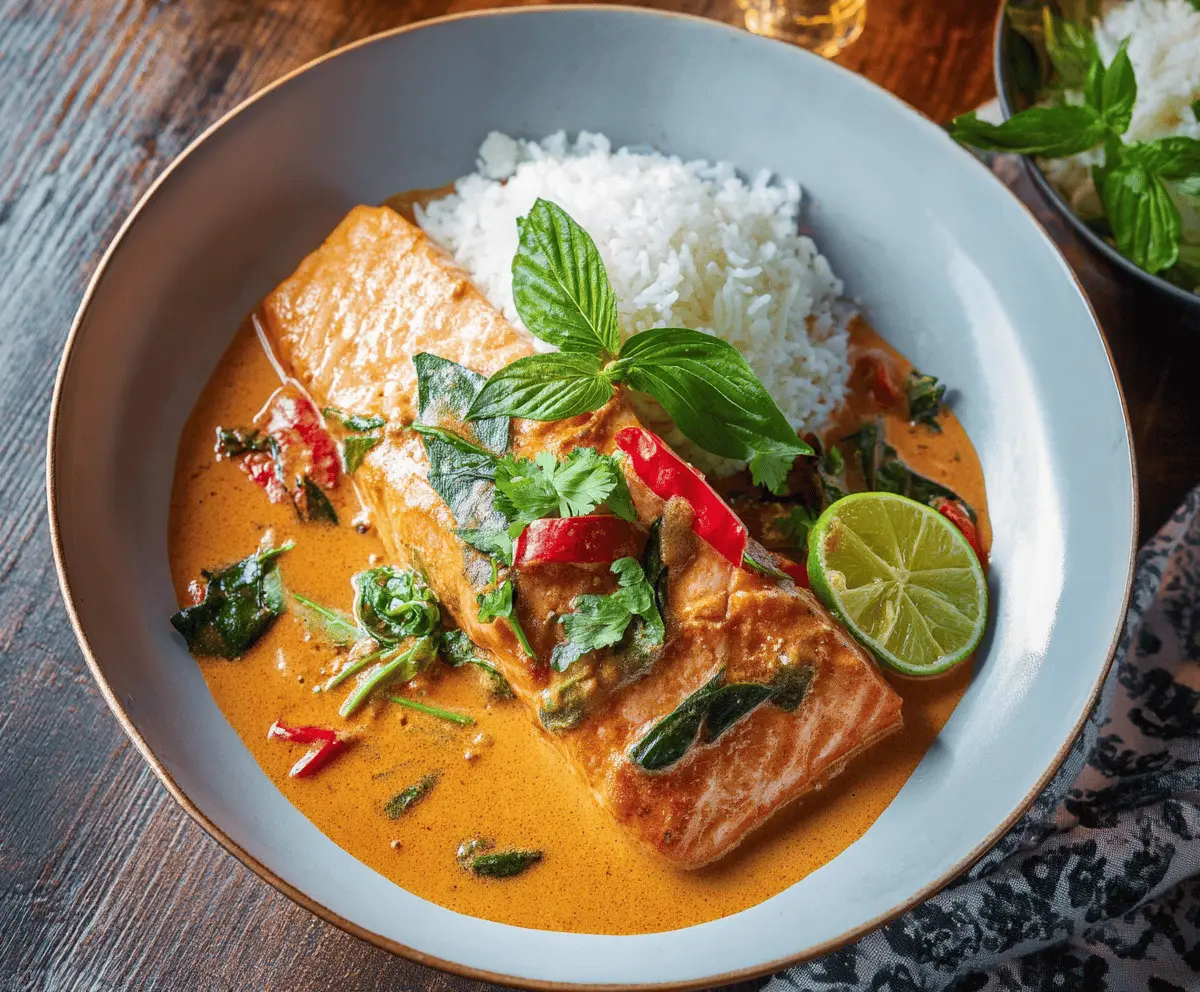 Enjoy this rich and flavorful Thai Red Curry Salmon with its aromatic herbs—a perfect harmony of creamy coconut curry and tender salmon! It’s sure to be a hit!