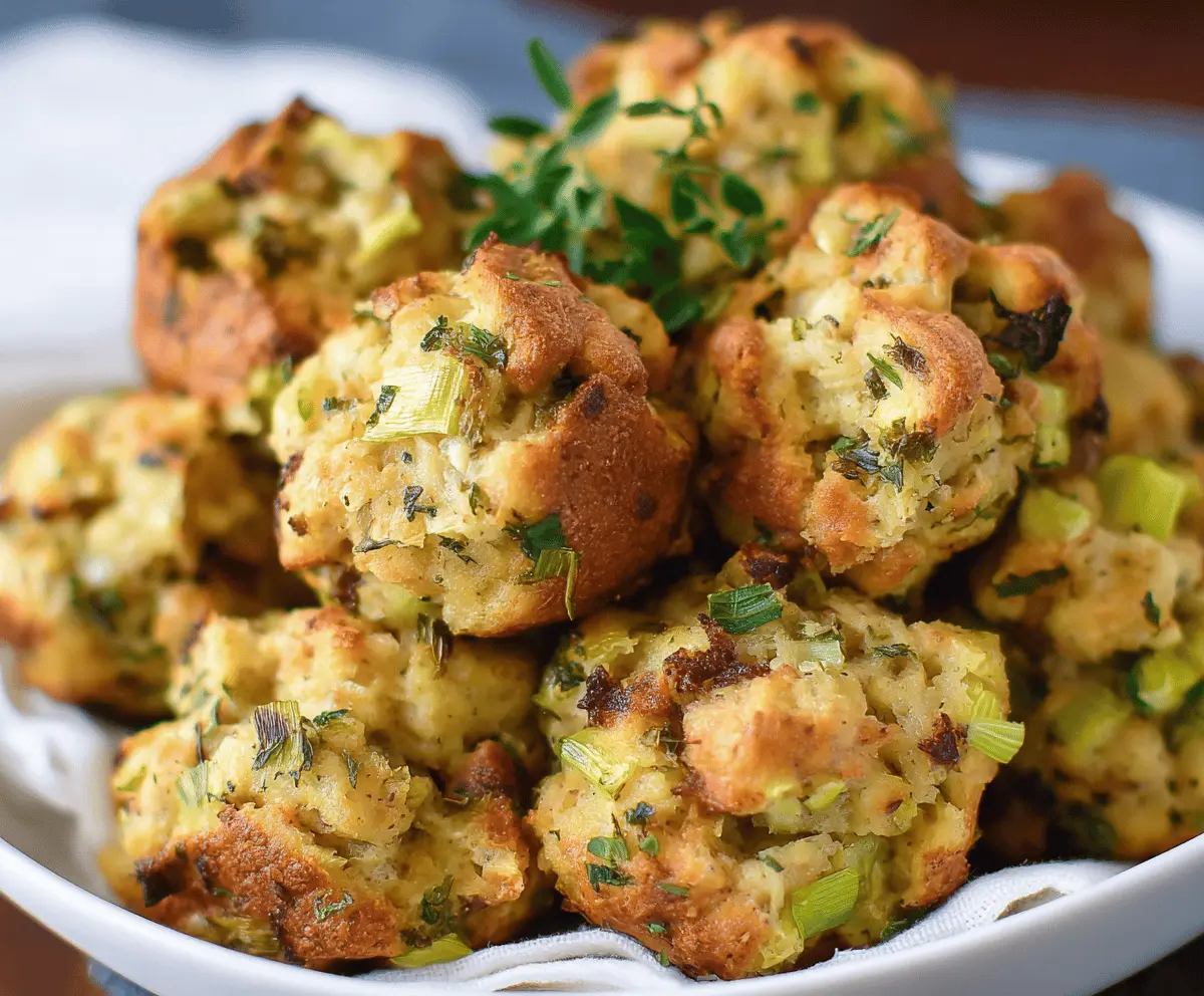 Delicious turkey stuffing balls served on a festive plate for holiday dinner.