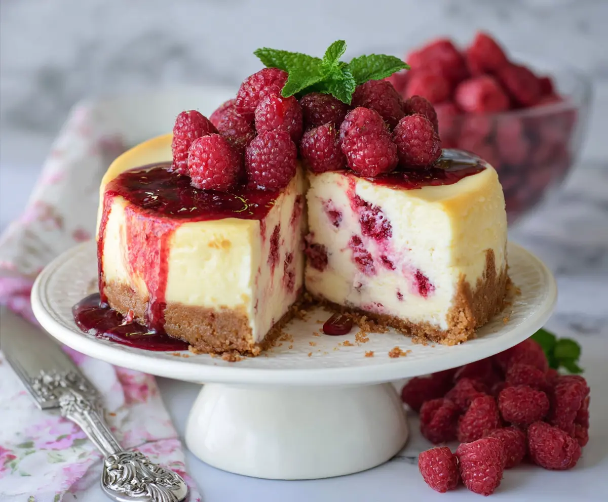When your cheesecake is thoroughly chilled, remove it from the springform pan and place it on a serving platter. Top with additional fresh raspberries and drizzle the raspberry sauce generously over the cheesecake, allowing some to spill down the sides. Lastly, if you like, garnish with fresh mint leaves for a pop of color.